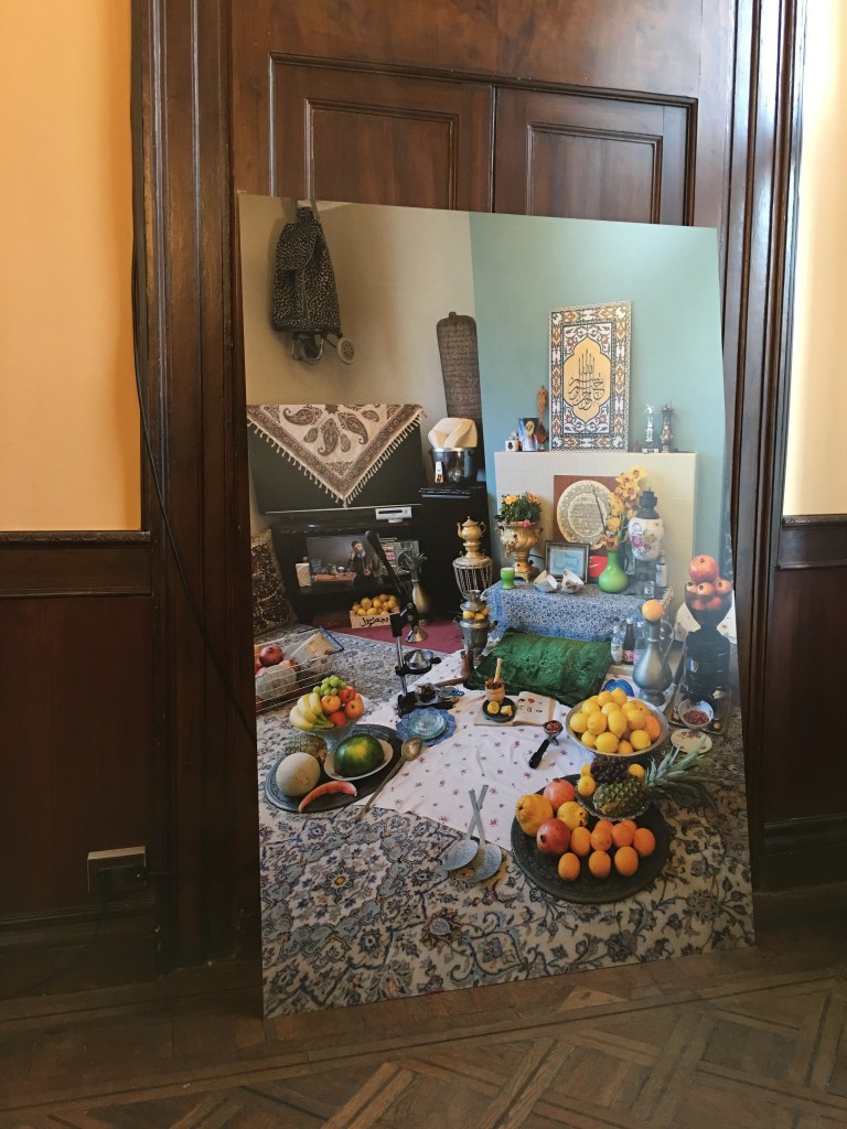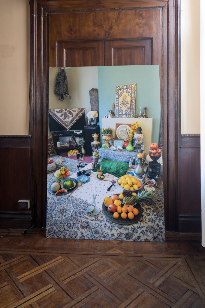 In the space Zahedi presents a large scale print of a scene from his home in London. This features inherited and found objects that are reflected against intimate moments; correlating the privacy of domestic portraits with the hidden layers of algorithmic networks. A video loop captures fleeting memories of a figure sitting on his rooftop in Tehran as he faces a sculpture in the form of maternal memento; acquiescing the seeking of cultural heritage into new avenues of consumptive behaviour. These visual elements are paired with a sound work, in which we hear the artist manually bottling drinks – an inadvertent grieving ritual that he underwent for hundreds of hours, culminating in the production of the beverages that are housed in one of the large cabinets and also feature in his site-specific performance #FakeBooze. source