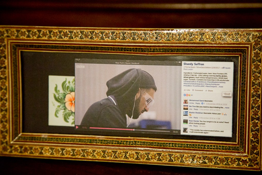 #FakeBooze was a one day performance for the launch of the Diaspora Pavilion in 2017. Here, Zahedi distributed over 500 bottles of a handmade drink called Shandy Saffron – a real shandy that did not contain any Saffron. The drinks were subsequently available throughout the course of the exhibition and displayed as part of my site-specific installation MANNA: Machine-Aided Neural Networking of Affect.