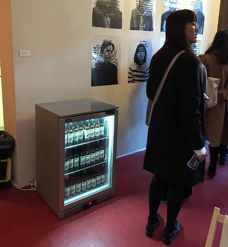A fridge filled with bottles of handmade shandy, courtesy of the artist. The shandies were available to purchase in private from the gallery’s cafe; or, you could just help yourself to one from a small fridge in the exhibition space. The latter option came at the the cost of being filmed, by a small camera within the fridge.