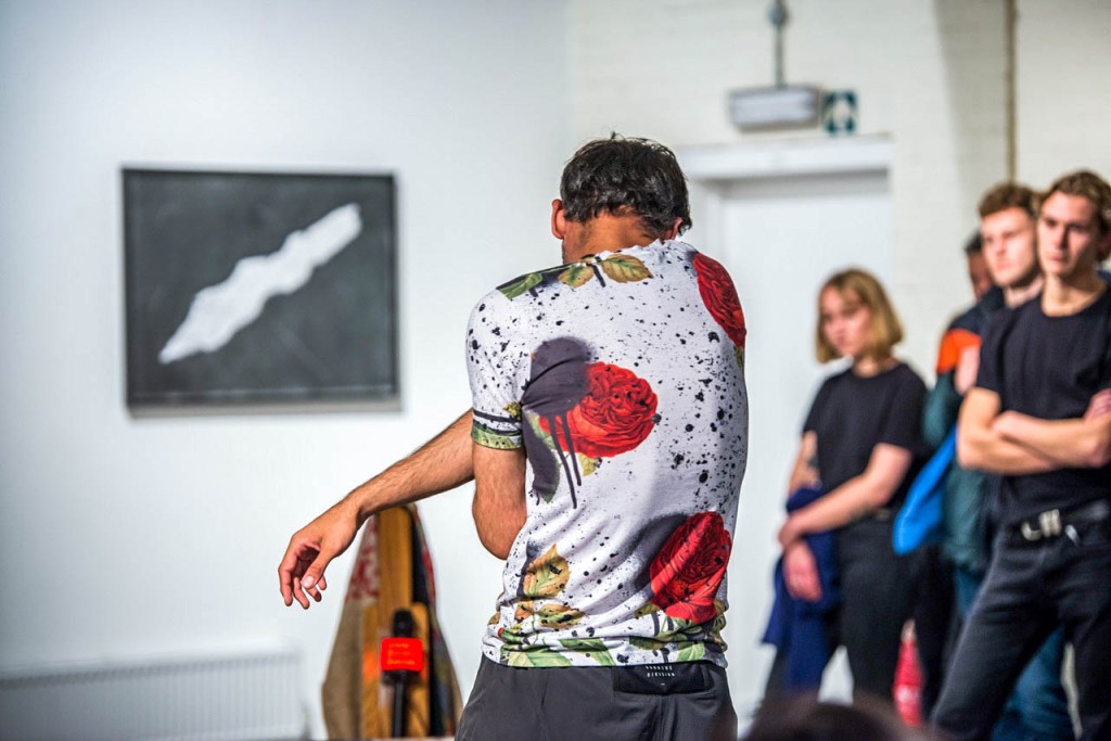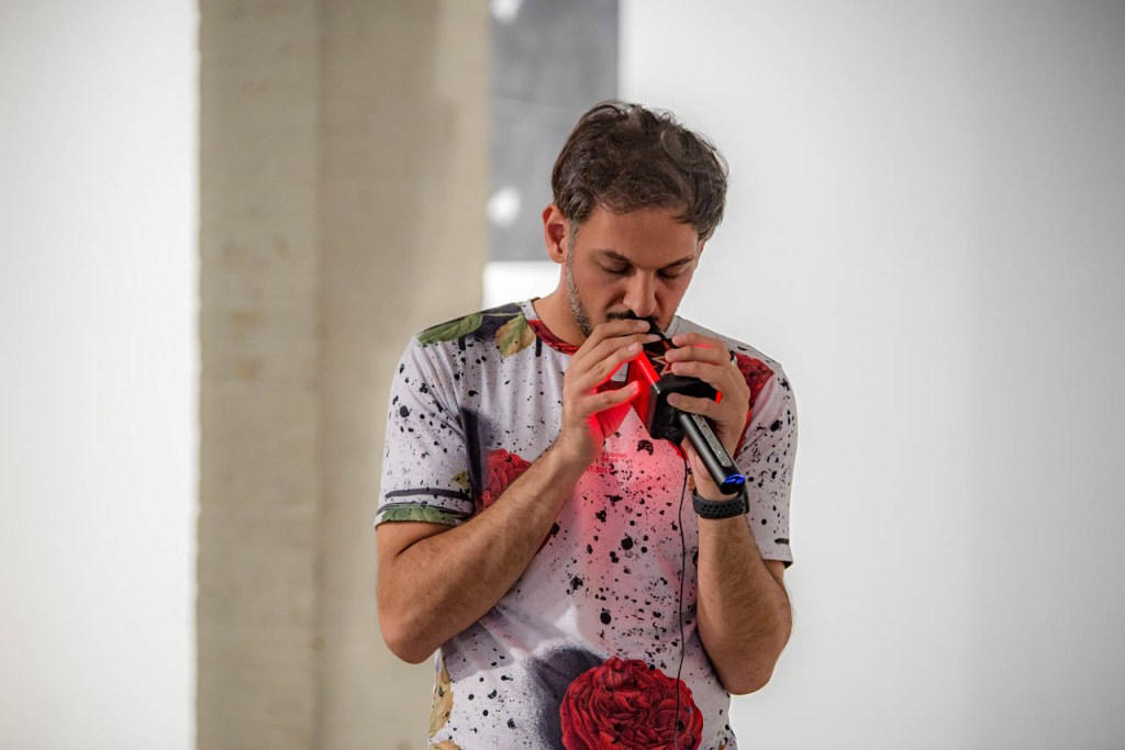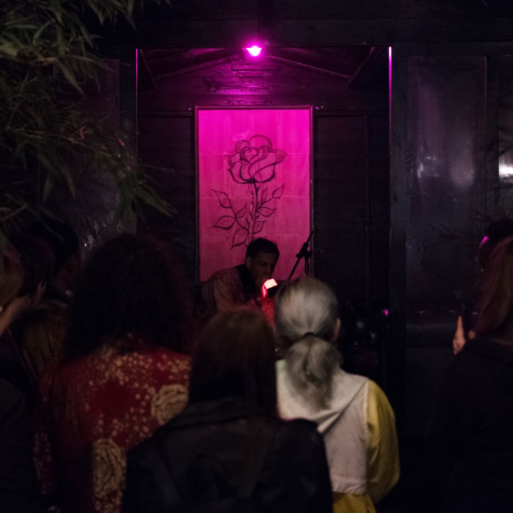 Donned in a floral, floor length robe Abbas Zahedi weaved his way through the crowd spritzing rose water. His presence was mighty, he manipulated the space and throughout his performance he created interventions; pockets of people gathered around him whilst he was chanting and reaching down to stroke the concrete floor. The backdrop had projections of flowers in bloom whilst the backing track was weighted with thumping bass and swirling helicopter-like sound effects. The soundtrack then built up to what I can only describe as industrial sound effects, it felt as though someone was using a disc cutter right next to me.It was piercing and sharp and the perfect interlude to Abbas’s spoken word, which ultimately, was the highlight of the night.