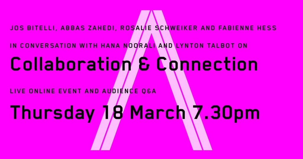 Artists Jos Bitelli, Abbas Zahedi, Rosalie Schweiker and Fabienne Hess join curatorial duo Hana Noorali and Lynton Talbot in conversation on the topic of: Collaboration & Care in a new live streamed talk + audience Q&A.