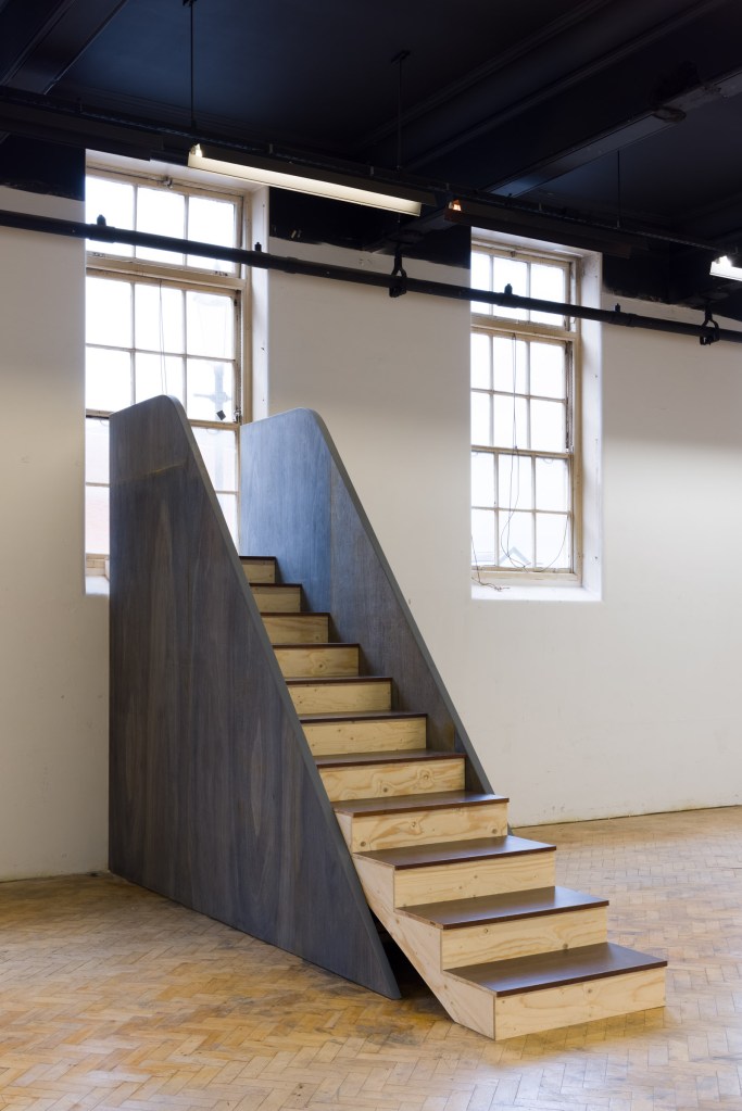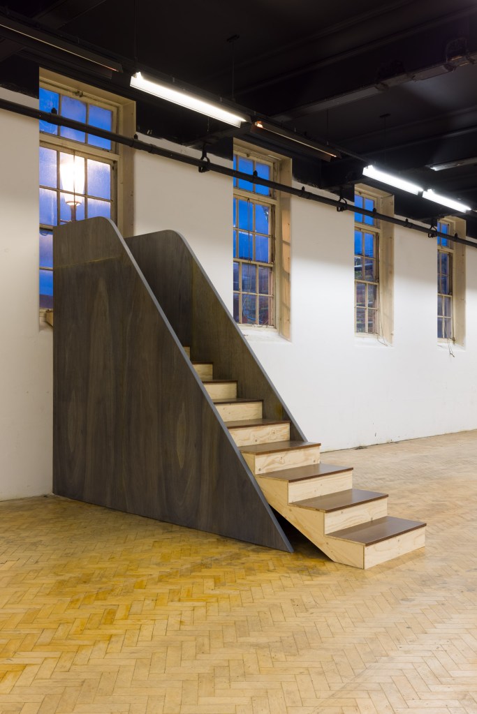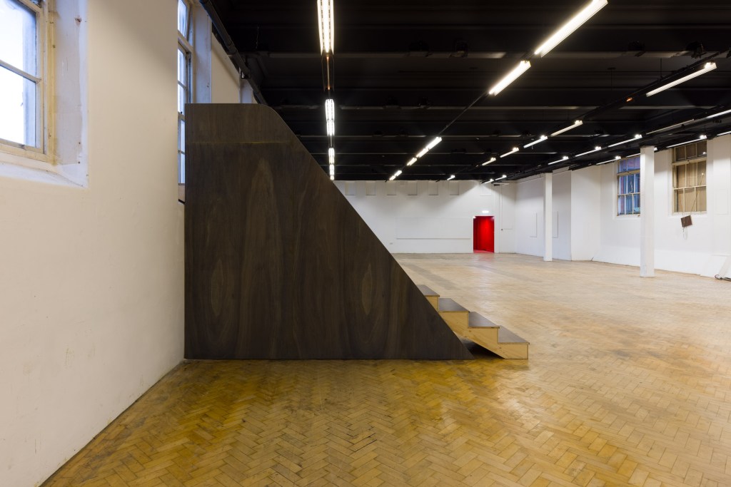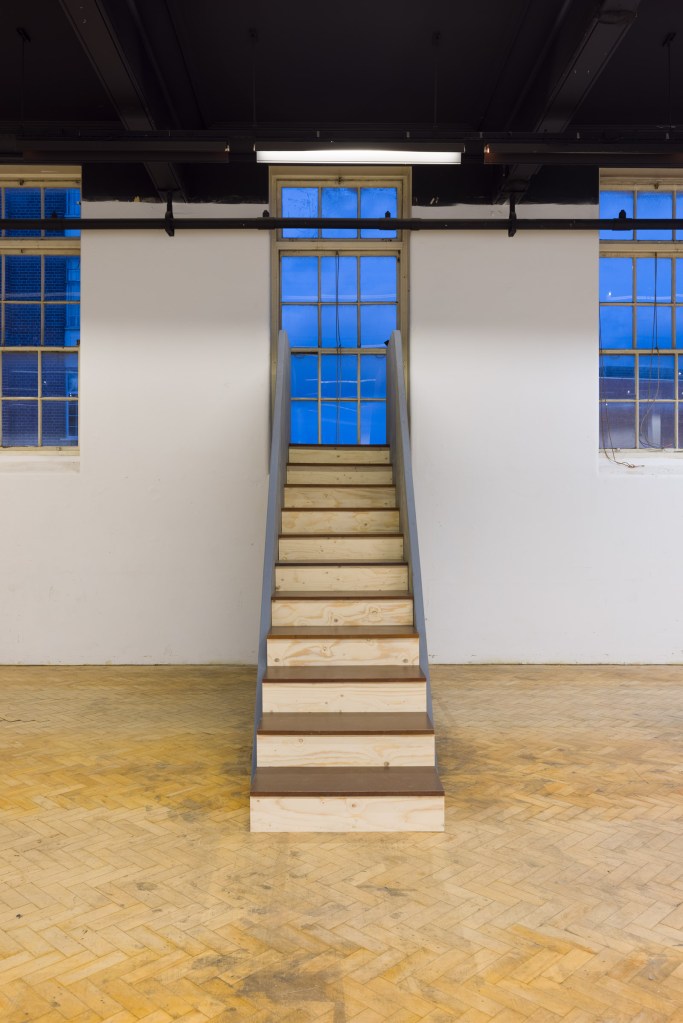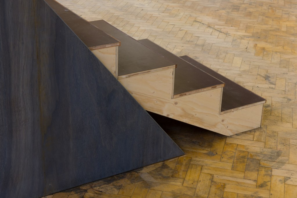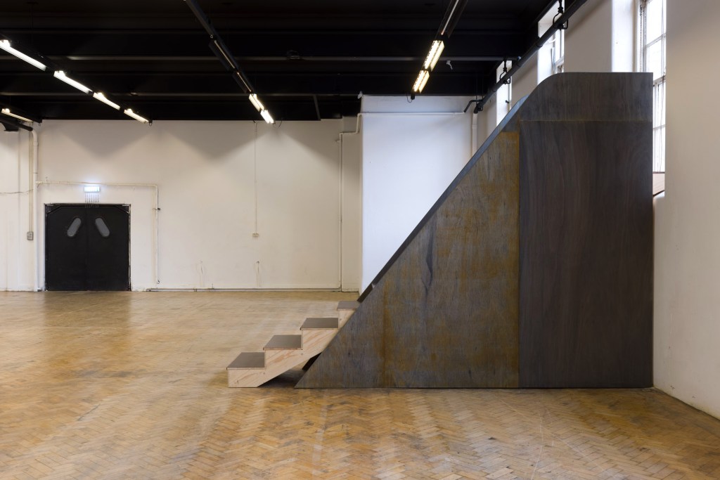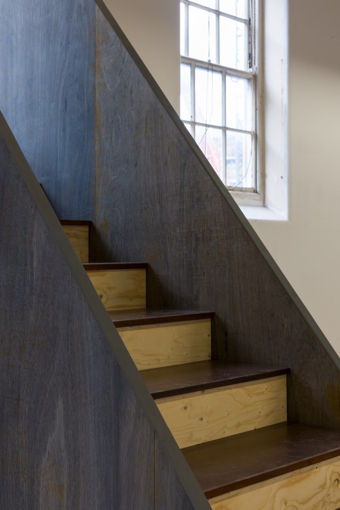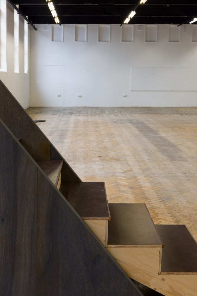 AZ: Yes. It took me a while to work out that ‘ascent’ over the window in the hall. At one point I came down with Covid, I was in bed with a fever, and then I just saw this image of extracting the wood from the bar in the basement, and making that into the structure that would overcome this architectural barrier embedded into the building. I think this desire to work with wood initially came from the presence of the vast parquet floor in the hall, and then I learned that this site used to be a timber yard before it was a sorting office. So when you go downstairs, you’ll see that there are eleven shelves missing in the bar area with very specific cut-outs that match the size of the steps going up to the window upstairs. The cross-sections of the cuts reveal the brown vinyl and various layers of wood used to construct the bar itself, and I’ve maintained those layers upstairs. The sculpture/staircase then becomes a kind of wood-collage that documents the different levels and materials of the building. So the steps are from the bar, and then their sides are made from plywood sheets that were covering the windows to the hall when I first got here, as you have on a construction site. After much deliberation, I chose to stain the outer plywood walls with a solution of iron sulphate, which reacts with the tannic acid in the wood and speeds up the ageing process to darken it to this kind of charcoal ash. This reaction is how some of the first writing inks were made, and so the earliest examples of the Bible, Quran, and even drawings by da Vinci were all made using this kind of iron-gall ink, usually combined with gum arabic. So when I talk to you about transplantation it makes me think of a readymade — a kind of transplantation theory in art — taking something from another context and using it in a new space or way, so as to remap its significance and its symbolic function. However, a medical transplant feels different in that there’s a more practical kind of functionality involved — say in bypass graft surgery. With this show, I feel like I’ve refined my approach to doing sculpture or readymades as having this functional aspect alongside a simple visual invitation, which is still in a sense ambiguous and creates the feeling of risk. The object itself asks the viewer whether they want to engage or not.