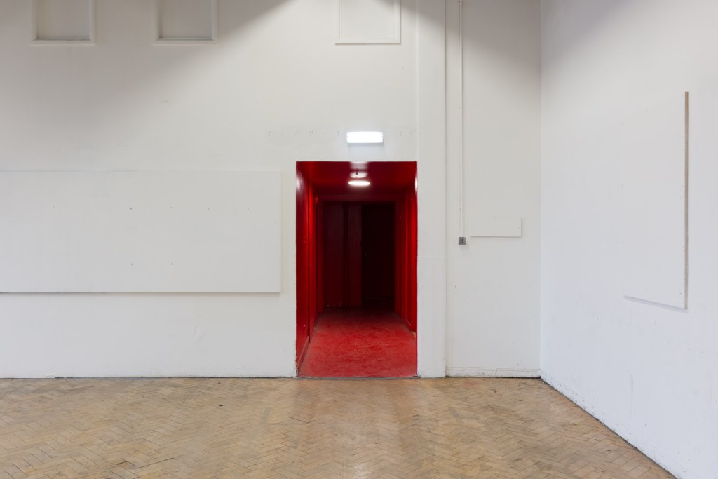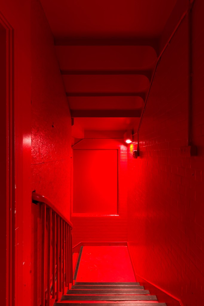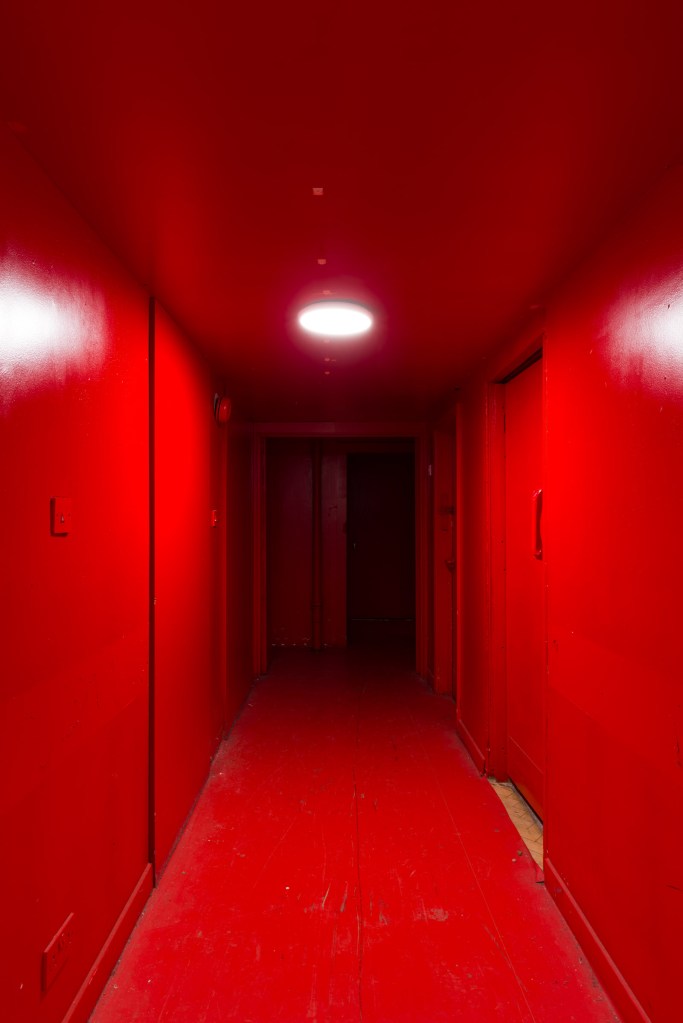 AZ: Those eleven floor tiles have been placed in the shape of an arrow that still follows the geometric grid of the floor, but I’ve tilted it off its original axis and so now it points the viewer to the red hallway, and the journey down another set of stairs into the belly of the work. In a lot of Muslim-majority countries, if you go into a hotel room or any kind of public space, you will often see these arrows on the ceiling or on the wall, or you might open a drawer and suddenly see an arrow pointing one way. That arrow is always showing you where Mecca is. So there’s this idea that in a Muslim’s day-to-day they need to be aware of this direction because they have to pray five times a day, and the prayer follows the path of the sun. In this case, if I had followed the geometry of the parquet floor, that arrowhead of the tiles would actually point towards Mecca, but I’ve turned it towards the red hallway instead. When I brought my son to the space he was scared to go into the red area by himself, he would call to me and say, ‘Help me go in the red.’ There’s this primal thing that becomes activated by descending into that much red.