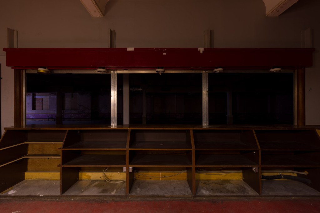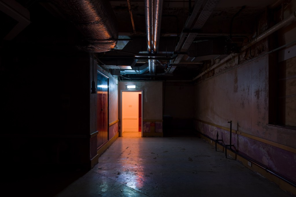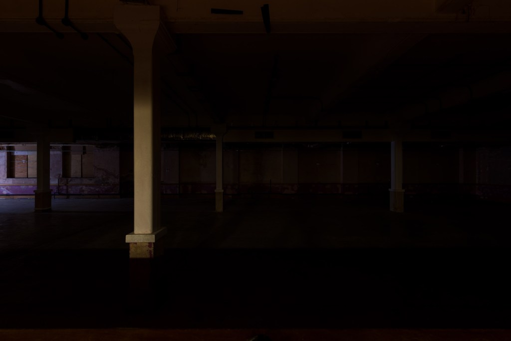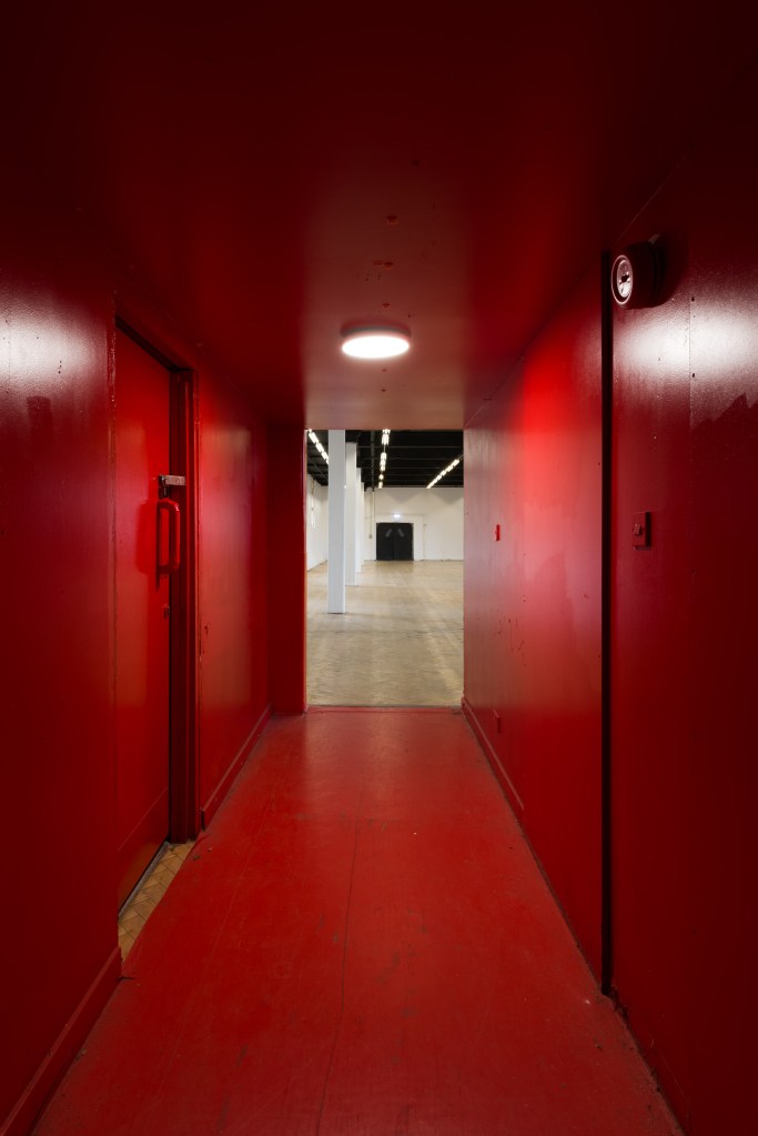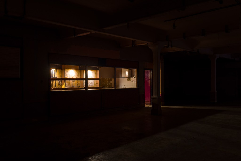 Abbas Zahedi: From the beginning it was clear to me that the entrance would be through the car park. However, because this building used to be a sorting office for the Royal Mail, it doesn’t have a postcode, and so there isn’t a set address that you can give to someone to get to this entrance. That became interesting to me, that there’s this process of finding it, and then once you do, you almost have this feeling of being somewhere ‘underground’, like it’s not part of the normal landscape around here. As you know, it’s a strange set of circumstances that have allowed the proposal of this show to exist in the first place. So that idea of how I came to be in the space, and how the viewer then comes to find the space, informed how I wanted people to navigate the experience of the building itself. On the inside, it feels like a lot of the passageways are dictated by varied forms of lighting, and so that really helped to create a path for the viewer. I wasn’t thinking in terms of discrete spaces but rather paths of light, like how could someone intuitively work their way through the environment. I wanted the light to be the guide. Even when you go downstairs, you’re immersed in this darkness after coming from a space that is very well-lit, so it takes some time for your eyes to adjust, and once you make that initial crossing, there’s this faint light coming from the bar, and so again that becomes a destination. As you move through, your eyes might have to adjust a few times, so you might pick up on other aspects of the space, of the work, or things might retreat into invisibility again.