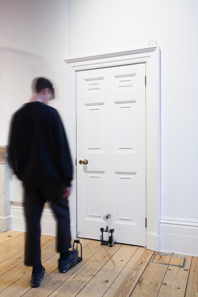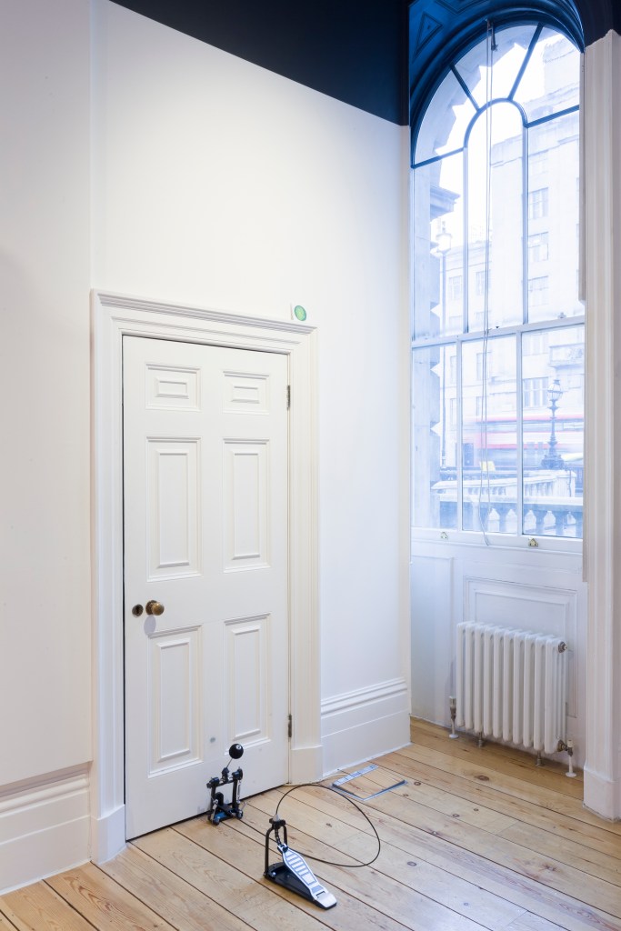Abbas Zahedi has developed a new commission during his three-month residency at Somerset House Studios, building on his recent work sampling meditation apps. Here, work through sound, performative remnants, and site-specific intervention, ritualistic rhythms provide an undercurrent that re-enliven mediated transcendence. Instead of a pure sonic encounter, Zahedi’s Door WC2R tunes the space of Gallery 31, enabling an improvised tempo, or rather, a de-choreographed palpitation.
